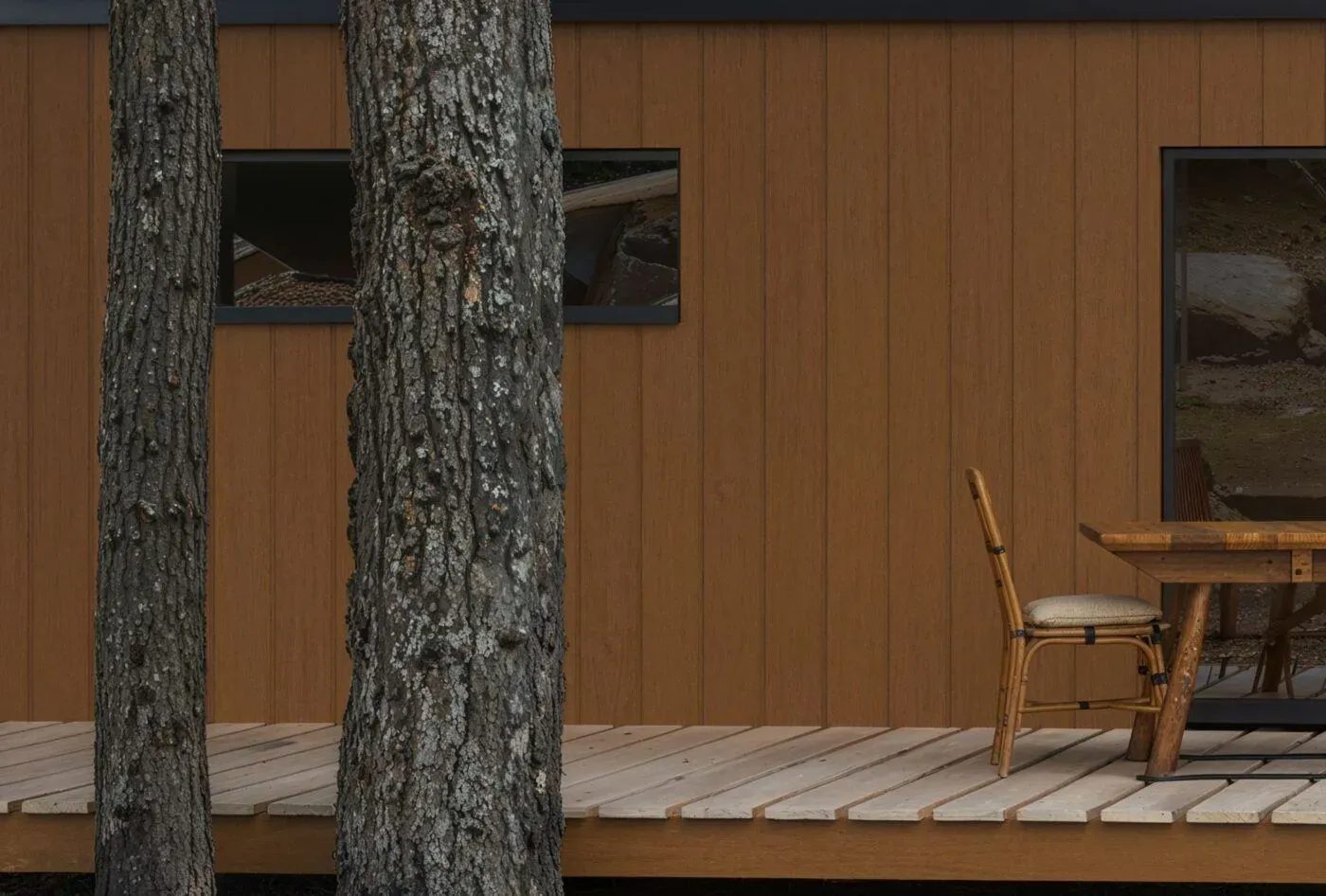 Dit prachtige huis in het bos laat zien hoe Kerama Harvest gevelbekleding perfect samensmelt met de natuur. De warme houtstructuur en diepe tinten geven het een authentieke, rustieke uitstraling.