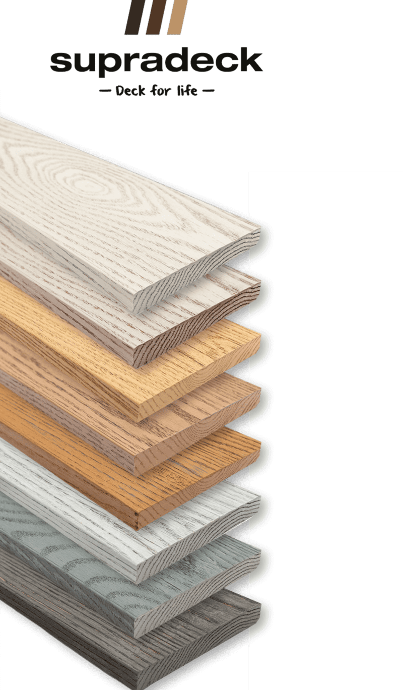 Planken voor vlonder en wand met strakke look van 6 hardhout soorten | Planken met 83m1 uniek hout patroon, in 8 kleuren en met een geavanceerde PU toplaag | De plank met 2 structuren in 4 kleuren, te gebruiken aan beide zijdes | |