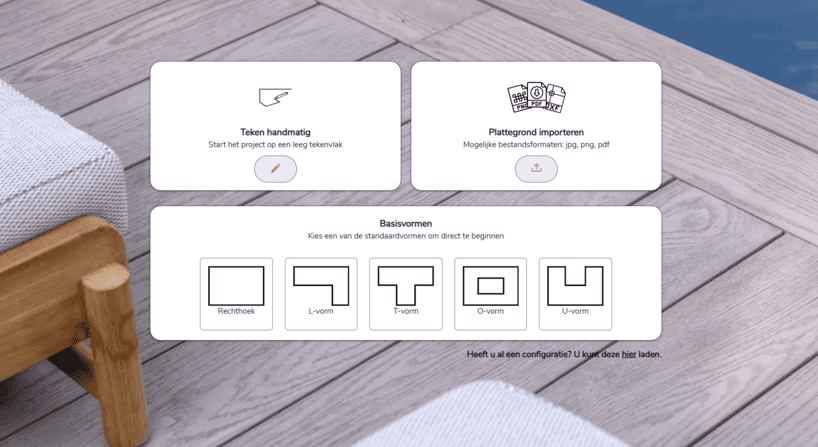 Met de Kerama Deckplanner geeft u uw buitenruimte eenvoudig vorm zoals u dat wilt. Kies uit standaardvormen of teken zelf, bepaal de afmetingen, selecteer uw favoriete legpatroon en stijl, en zie direct hoe uw ontwerp tot leven komt. Onze tool helpt u stap voor stap – van plattegrond tot materiaalkeuze – zodat u altijd zeker weet dat uw vlonder precies aansluit bij uw wensen.